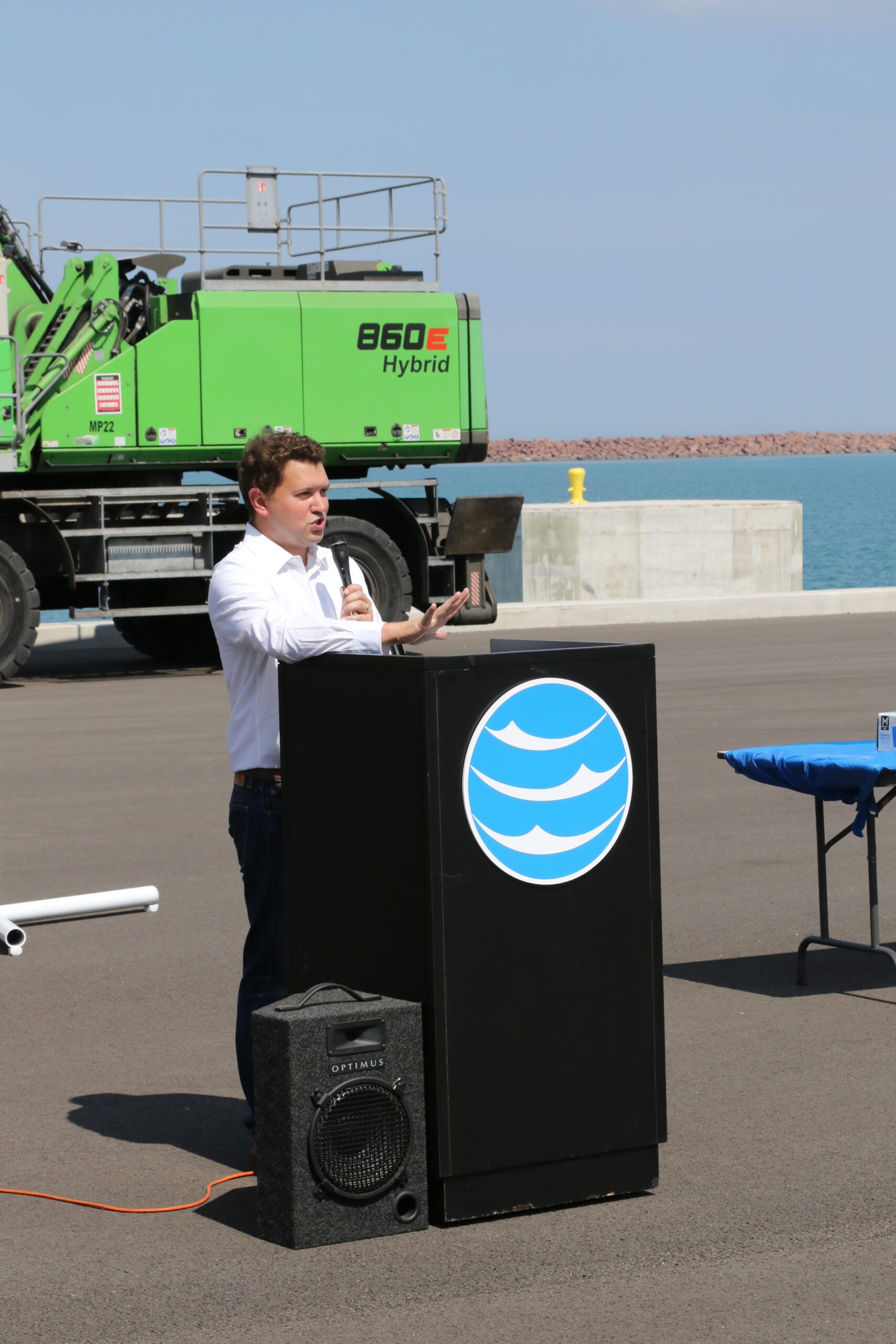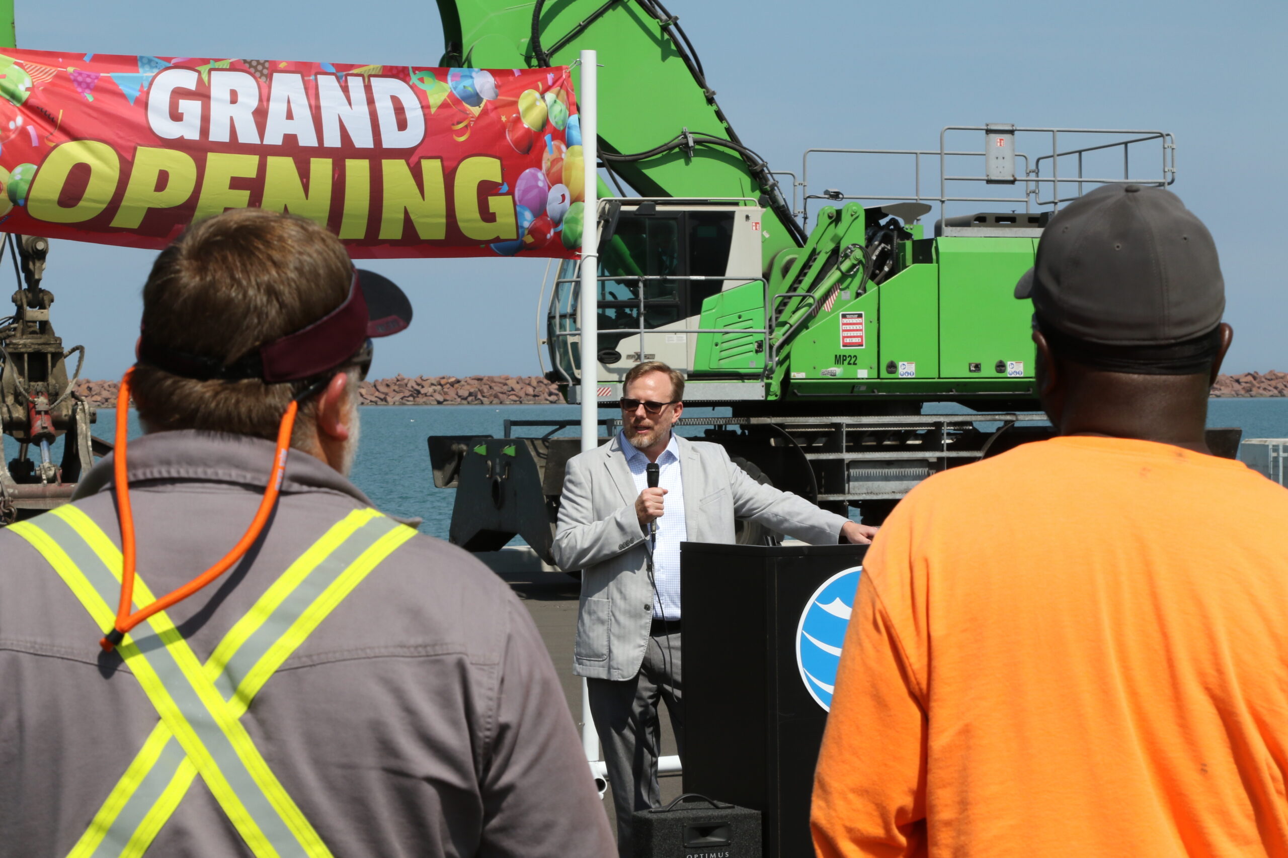 - Portage Mayor Austin Bonta addresses the crowd at Berth 5