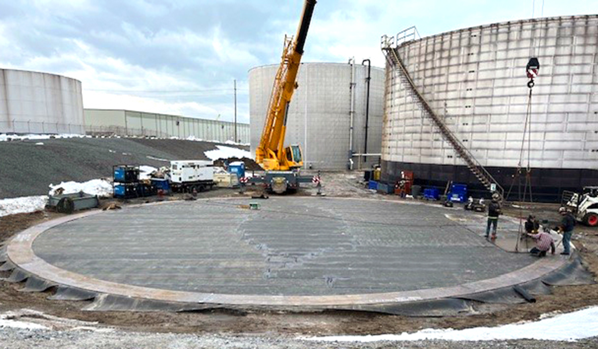 - Early in construction on a new tank, the concrete pad is taking shape.