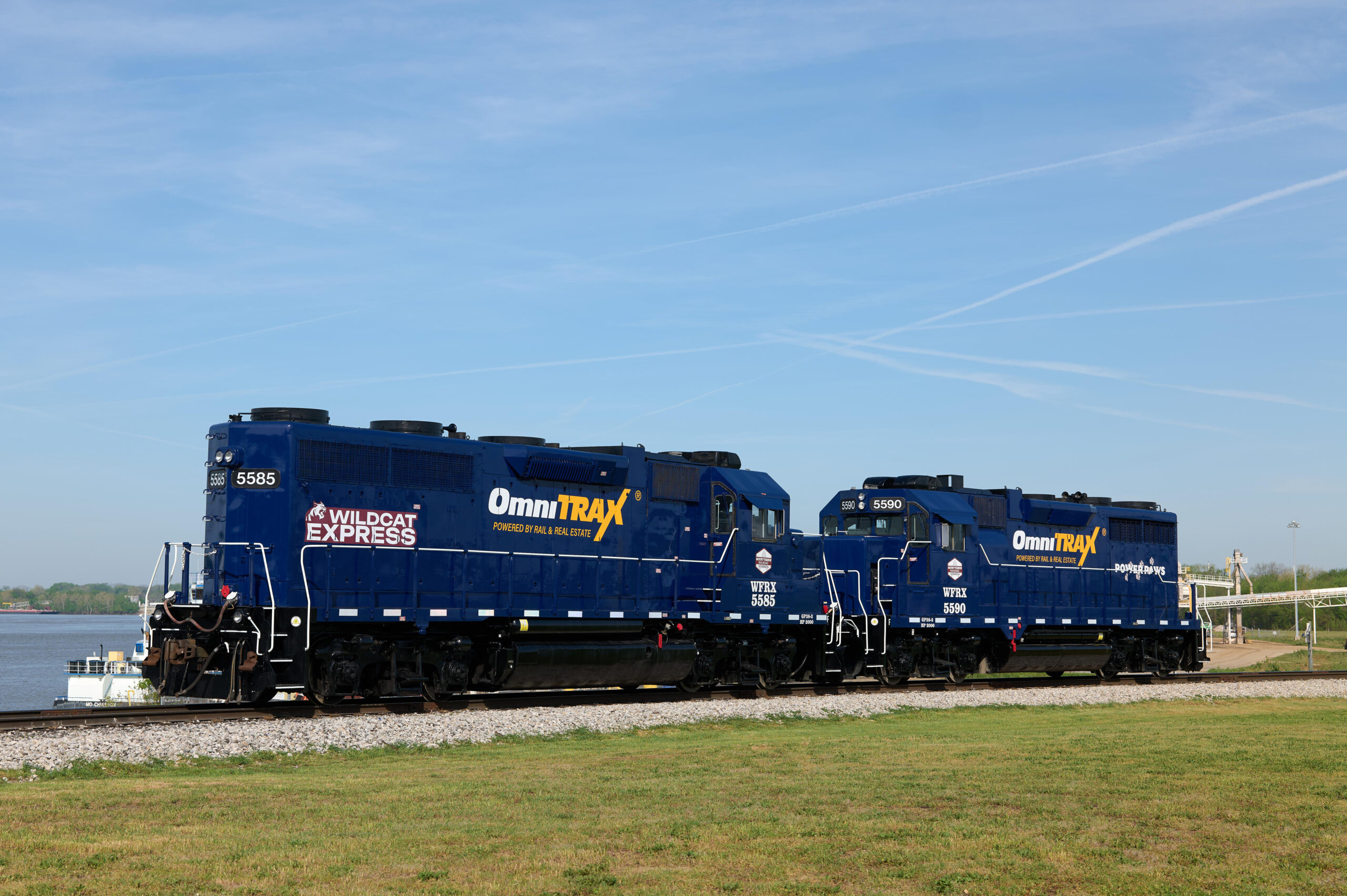 - Freshly-painted and overhauled GP38 locomotives in OmniTRAX’s livery, showing off ‘Wildcat Express’ and ‘Power Paws’ logos – and community pride.